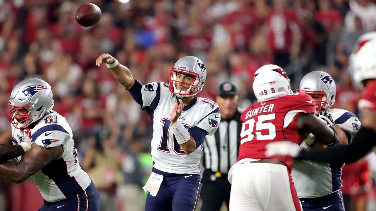 With Jimmy Garoppolo replacing Tom Brady at QB, New England Patriots didn't change a thing on offenseIn his first career start, New England Patriots quarterback Jimmy Garoppolo completed 72.7 percent of his passes (24-of-33) for 264 yards and a score in the Week 1 win over the Arizona Cardinals.Those numbers -- along with a Total QBR of 73.0 -- mesh with the tape on the young quarterback.Garoppolo showcased his quick release, pocket management and ability to run the Patriots' offense with efficiency.